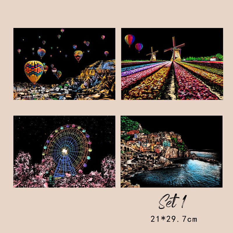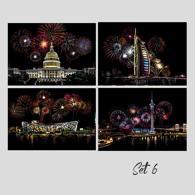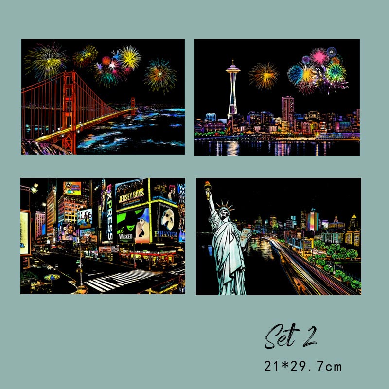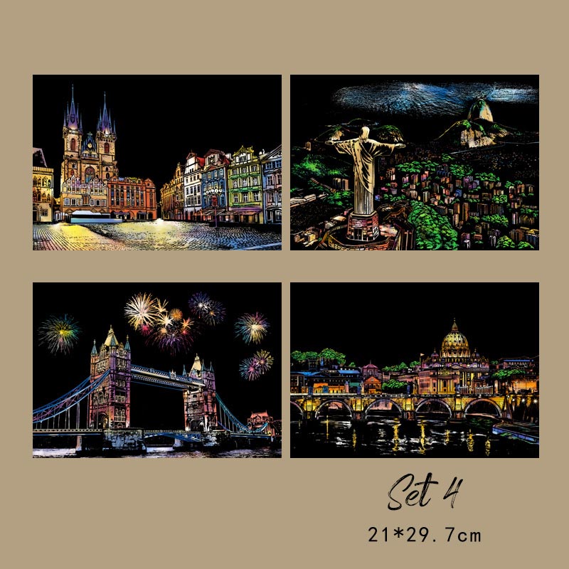 Cet ensemble comprend 4 scènes magnifiquement conçues, offrant une activité artistique amusante et relaxante. Libérez votre âme d’artiste en révélant de superbes paysages urbains en grattant la couche sombre.