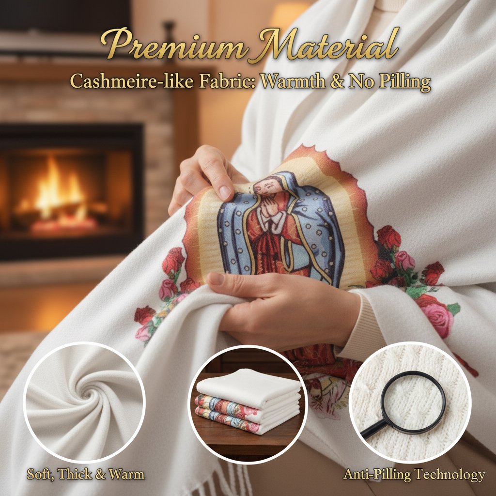 Chaque châle arbore un magnifique motif représentant la Vierge Marie, symbolisant la paix, l'espoir et la protection divine. Ce n'est pas seulement un accessoire, c'est un rappel quotidien de la foi et de la gratitude pendant cette période sacrée.