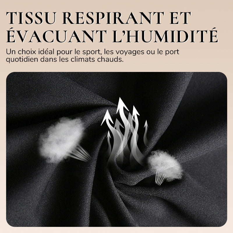 TISSU RESPIRANT ET ÉVACUANT L’HUMIDITÉ – Fabriqué à partir d'un tissu mélangé respirant, il évacue rapidement la transpiration de la peau et inhibe l'accumulation d'odeurs, ce qui en fait un choix idéal pour les entraînements, les voyages ou le port quotidien dans les climats chauds.