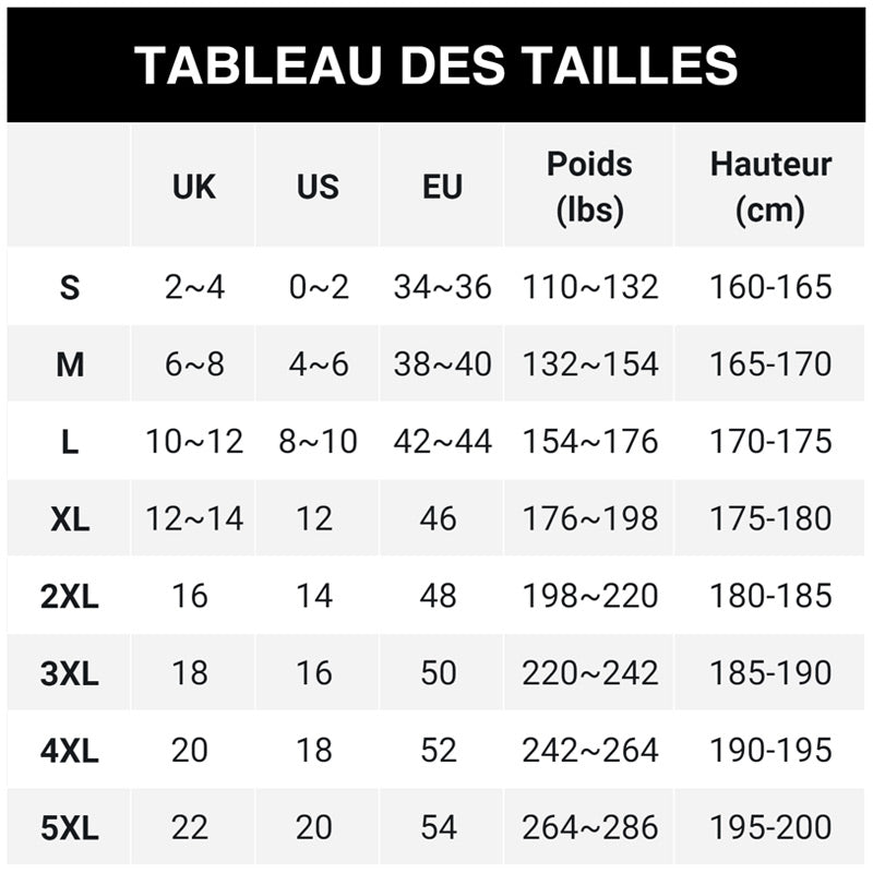 Vérifiez le tableau des tailles avant de commander pour assurer un ajustement optimal.